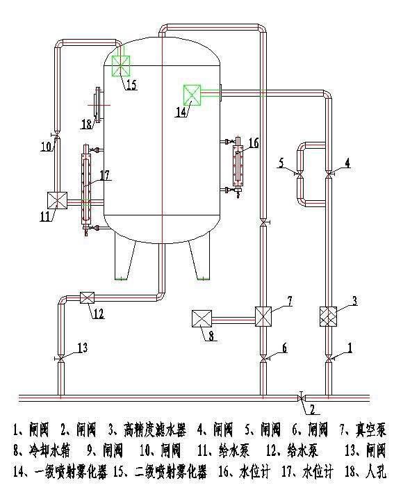 兩級噴射式真空除氧器(簡稱無頭除氧器)、由一級高噴射裝置、二級噴射裝置, 增壓泵組, 真空泵組,減溫水箱,流量計(jì),汽動閥,高精度濾水器,多位閘閥,PLC全自動控制箱等組成。