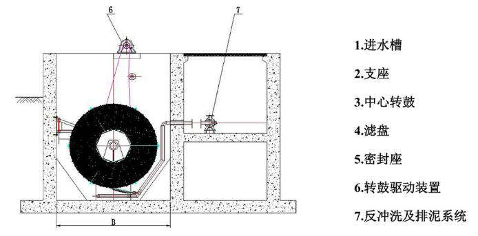 圖為纖維轉(zhuǎn)盤過濾器的安裝布置示意