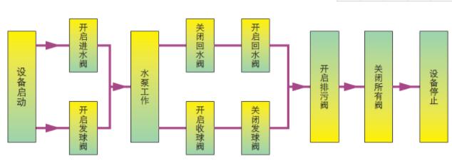 ⑷按綠色手動(dòng)啟動(dòng)按鈕,這時(shí)發(fā)球閥工作指示和收球閥工作指示燈亮起,過(guò)15秒后膠球輸送泵啟動(dòng),膠球泵工作指示燈亮起,清洗開(kāi)始。清洗過(guò)程持續(xù)60秒,清洗完后,會(huì)關(guān)閉發(fā)球閥,打開(kāi)補(bǔ)水閥,進(jìn)入收球過(guò)程,60秒后,收球完成,關(guān)閉收球閥,15秒后開(kāi)始排污,排污時(shí)間約10秒,排污完后,自動(dòng)關(guān)閉排污閥、補(bǔ)水閥,整個(gè)清洗流程完成,準(zhǔn)備進(jìn)入*二次循環(huán)清洗指示。