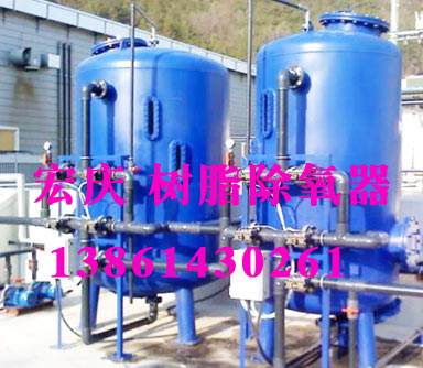 內(nèi)裝配位化合物功能團(tuán)去氧樹(shù)脂的除氧器,除氧失效后用水合胼還原再生,如宏慶連圣華康06型去氧樹(shù)脂除氧器。