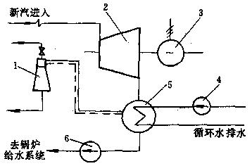 1-抽氣設(shè)備;2-汽輪機(jī);3-發(fā)電機(jī);4-循環(huán)水泵;5-凝汽器,6-凝結(jié)水泵