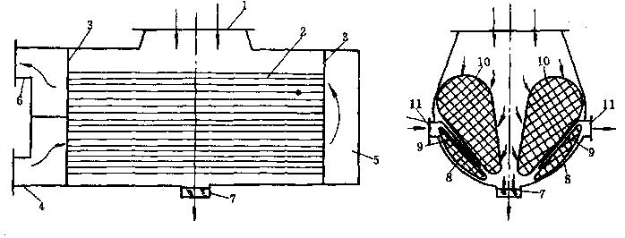 1-蒸汽人口;2-冷卻水管,3-管板;4-冷卻水進(jìn)水管;5-冷卻水回流水室;6-冷卻水出水管;7-凝結(jié)水集水箱(熱井);8-空氣冷卻區(qū);9-空氣 冷卻區(qū)檔板;10-主凝結(jié)區(qū);11-空氣抽出口